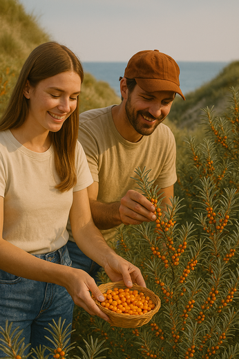 Langs onze kust, tussen zand en helmgras, groeien ze: feloranje duindoornbessen. Voedzaam, aromatisch en met een frisse, lichtzure smaak die nergens anders op lijkt. Elke nazomer plukken we ze met de hand, precies op het moment dat ze op hun best zijn.